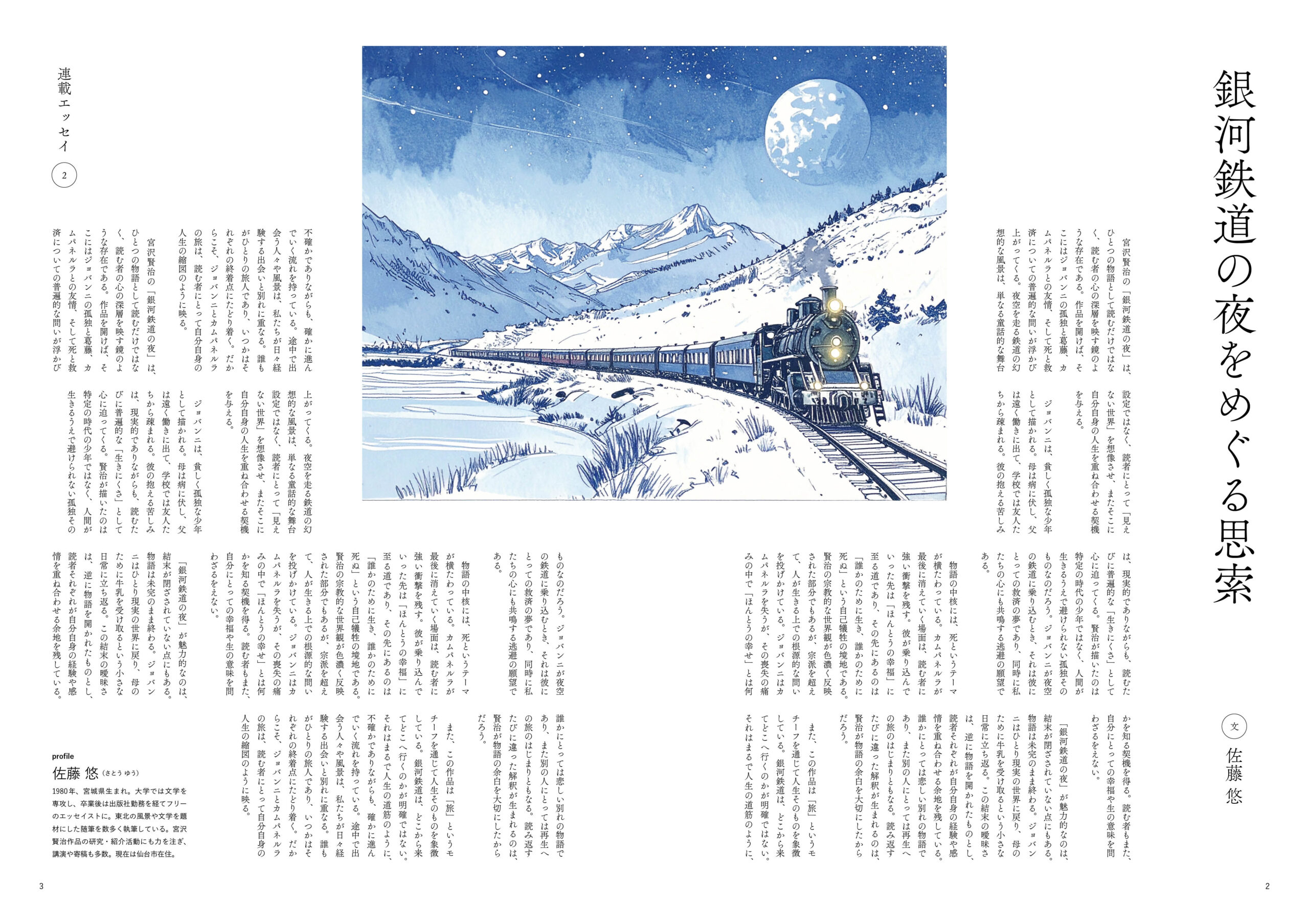 本文は5段のうち4段を使い、右端の1段にはタイトルと作家名を置いています。見開きの中央にはイメージイラストを配置し、本文を読み終えたところで左下にプロフィールを添えました。すべてをマージンに合わせることで、シンプルで標準的な誌面が立ち上がります。