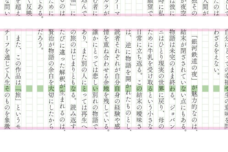 縦組みでは、行を横から眺めたときに文字がしっかり揃っていることが重要です。新聞のように整然と並んだ誌面が典型的な例で、縦組みの基本は「揃いの美しさ」にあります。そのために欠かせないのが、いくつかの設定です。