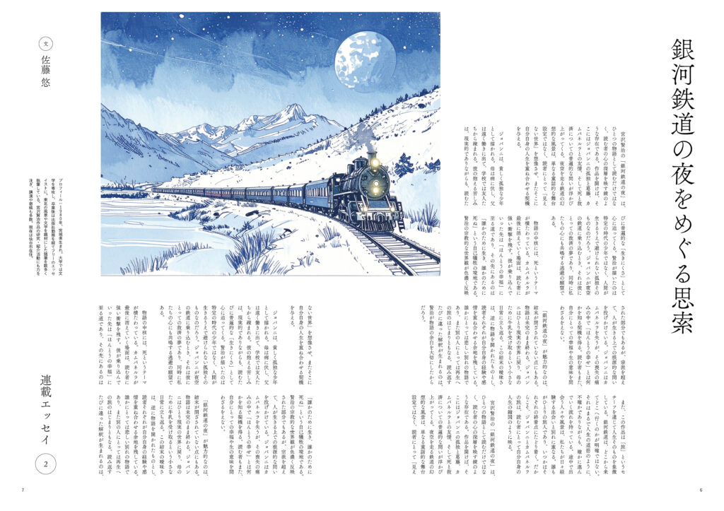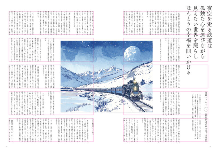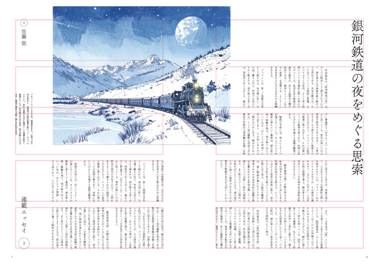 C案では、本文を見開きにまたがって配置し、上部1段を余白として残しています。イメージは左ページ寄りに置きつつ、わずかに右ページにもかかるようにして、ページをまたぐ広がりを演出しています。誌面の四隅の処理も重要で、右ページの上部にはタイトルを、左ページの隅には「連載エッセイ」というコーナータイトルや「文・佐藤悠」といったクレジットを配置し、全体をきちんと締めています。また、画像やテキストのツラを正確に揃えることで、安定感のあるレイアウトに仕上がります。