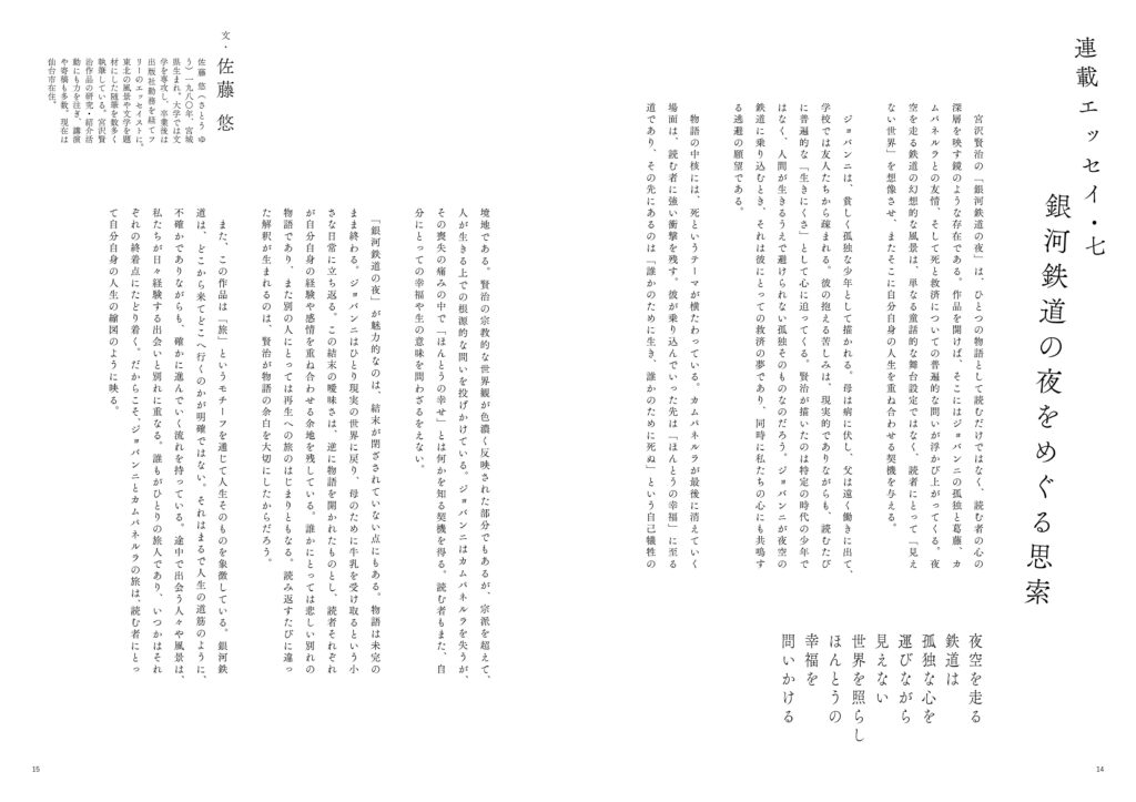 F案は、あえて5段組みを無視し、マージンだけをベースにした構成です。本文は14Q、行送り200%(28H)と大きめに設定し、段落を1行40文字で設計するなど、文庫本風の「しっかり読ませる」文字組を意識しました。マージンを共通にすることで、他ページとの統一感も保たれます。さらに本文の行間に罫線を入れるなど、装飾効果を控えめに加えることで、シンプルながらもデザイン性の高い仕上がりとなっています。イメージを使わなくても、文字組だけで誌面が美しく成り立つことを示す例です。