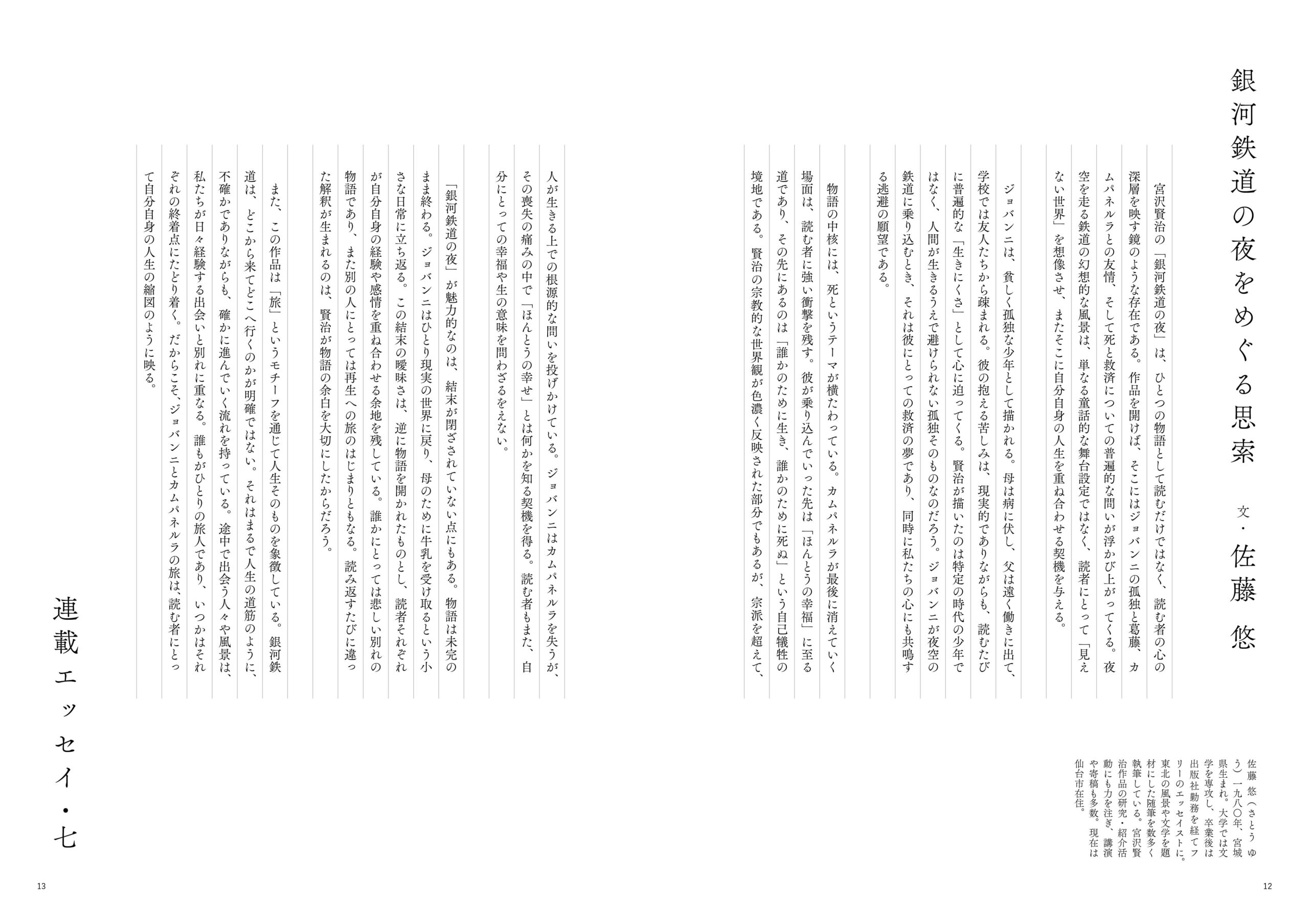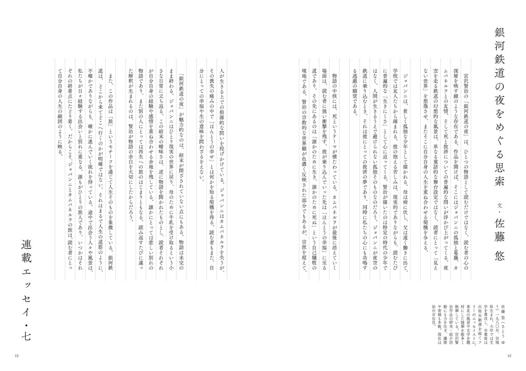 G案は、F案をさらに展開したパターンです。同じく1段40文字を基本としながら、本文サイズを13Qに落とし、行送りは28H、さらに字間を2Hアケて、ゆったりとしたリズムをつくっています。右ページと左ページで段落の位置をずらすことで、静かな中にも動きを感じさせる構成になっています。可読性はやや犠牲になりますが、文字組に冒険を加えることで新しい見え方を引き出す挑戦的な例といえるでしょう。